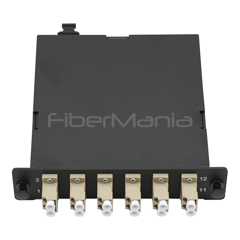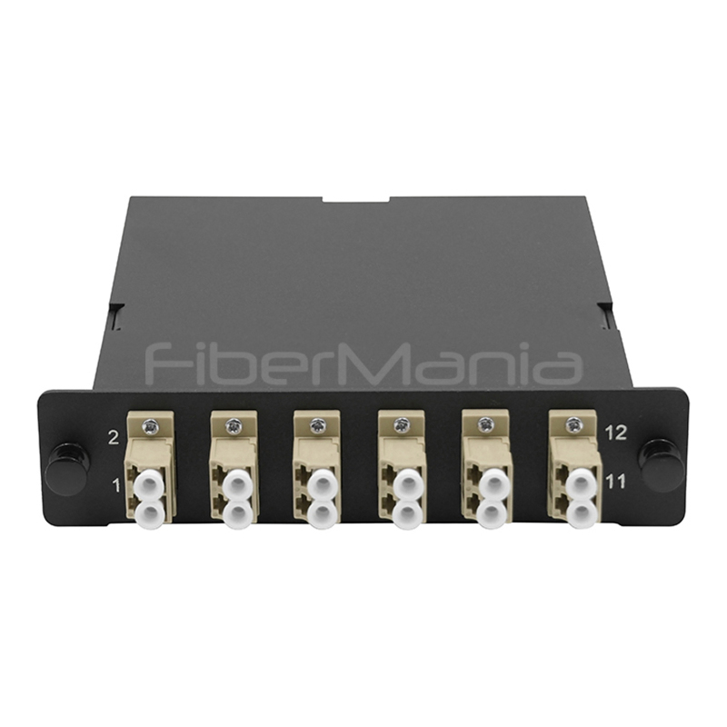 Cassete MPO/MTP capaz de aceitar 6-24 fibras. Estes cassetes são adequados para uso com aplicações Singlemode, Multimodo 62.5 e 50um, bem como Otimizadas a Laser, OM3 e estão disponíveis nos tipos de conectores LC, SC, ST, FC, MTRJ. O cassete MPO/MTP vem pré-instalado com os adaptadores necessários com mangas de cerâmica de zircônia para maior compatibilidade com todas as aplicações. Os adaptadores são codificados por cores de acordo com a aplicação em uso (Azul = 9/125; Bege = 62.5 e 50um; Aqua = OM3; Verde = APC). Todos os adaptadores vêm de fábrica com tampas de proteção contra poeira.